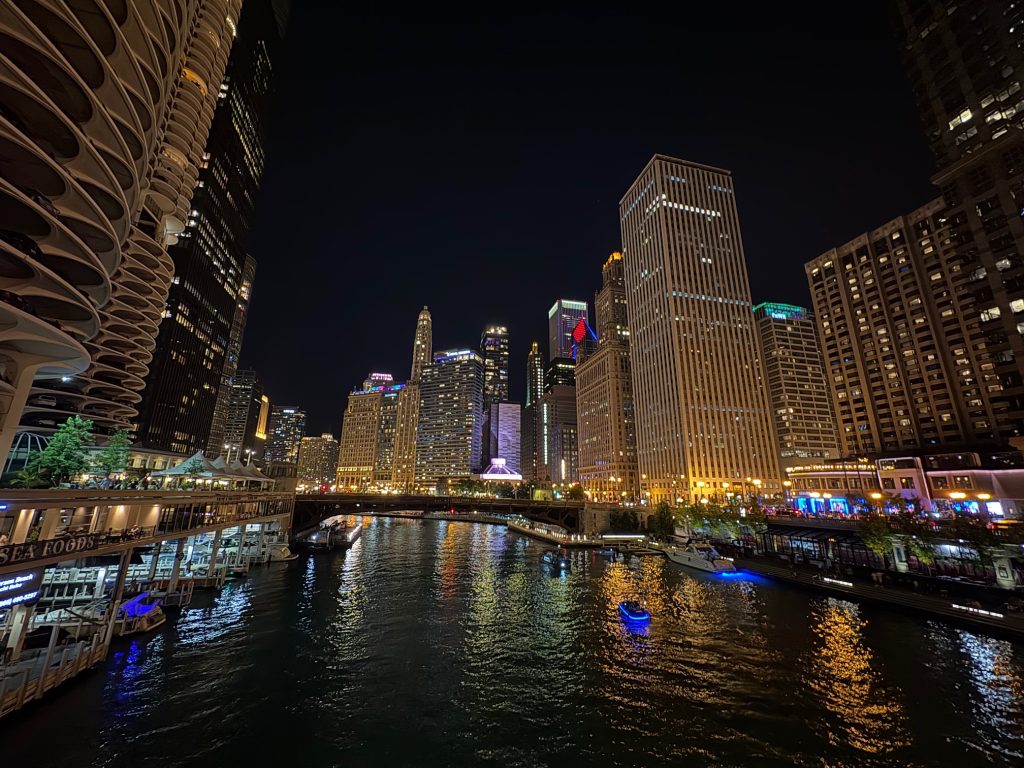 One of my favorite memories in Chicago was seeing the city at night. In this picture I was on the N Dearborn St bridge. The corncob-shaped Marina Towers lit up the left side, the river shimmered beneath the city lights, and the skyline stretched quietly into the night.